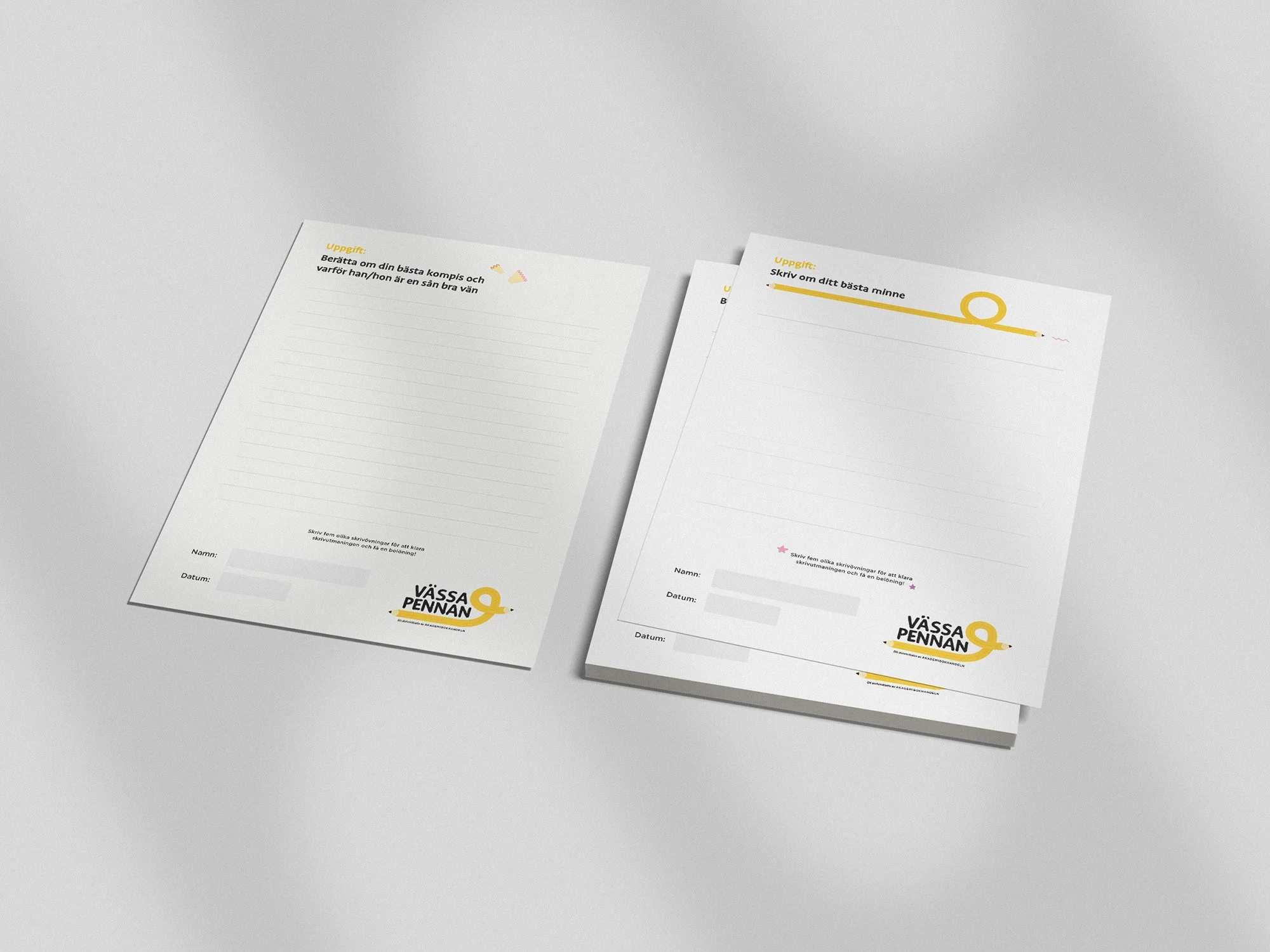 För Akademibokhandelns initiativ ”Vässa pennan”, som ska främja skrivglädje hos barn genom olika aktiviteter, tog Kreativism fram ett grafiskt manér. Målet var att hitta ett uttryck som förmedlar ett fritt och kreativt skrivande och som tilltalar barn i åldern 7-15 år.