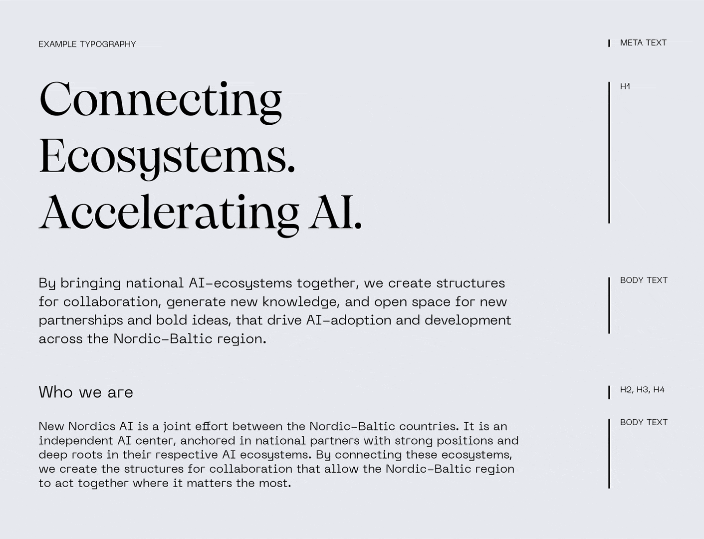 New Nordics AI:s visuella identitet är skapat för att signalera ledarskap, trygghet och framåtanda. Varumärket förenar tradition och mänsklig värme med teknologi och innovation som huvudkärna, och uttrycker den unika nordiska värdegrunden där tillit, öppenhet och framsteg möts.
